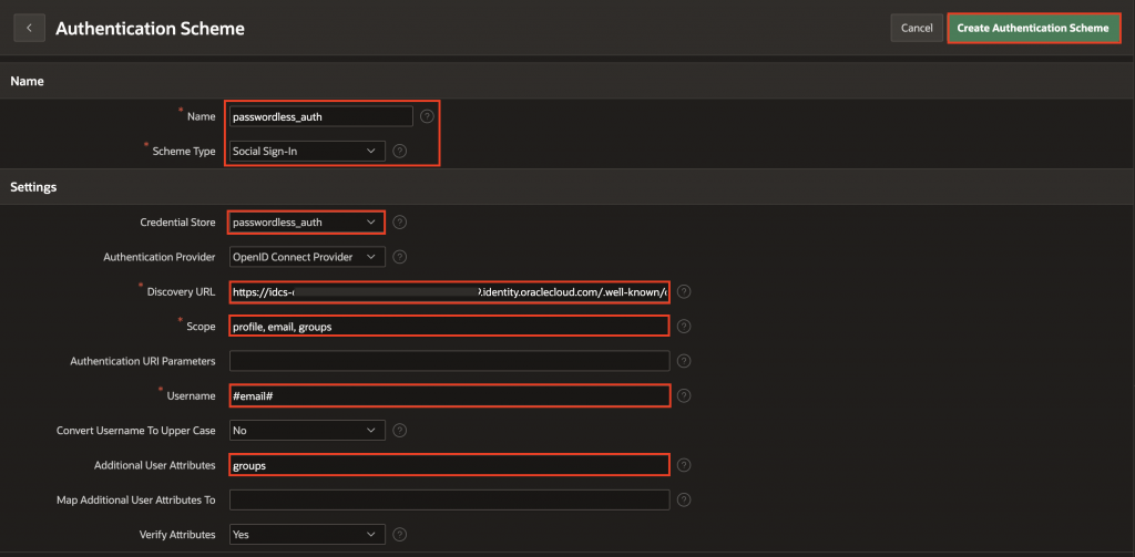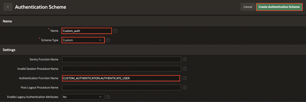 Navigate to Shared Components > Authentication Schemes. Click Create and fill in the following details: