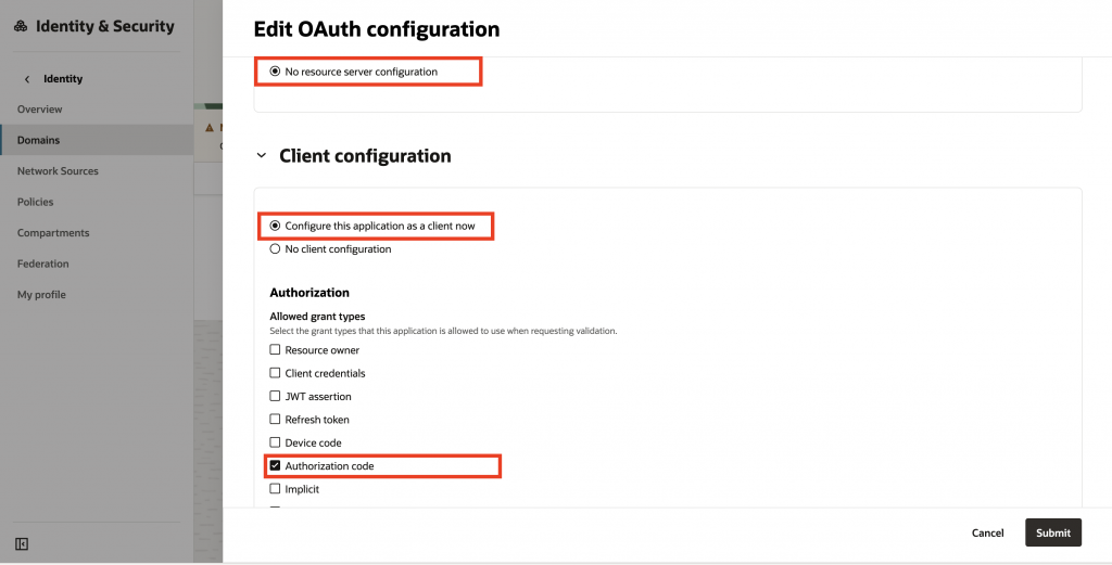 8. For Resource server configuration, select No resource server configuration. For Client configuration, select Configure this application as client now, select Authorization Code from the list of supported grant types, and scroll down to continue configuring the application.
