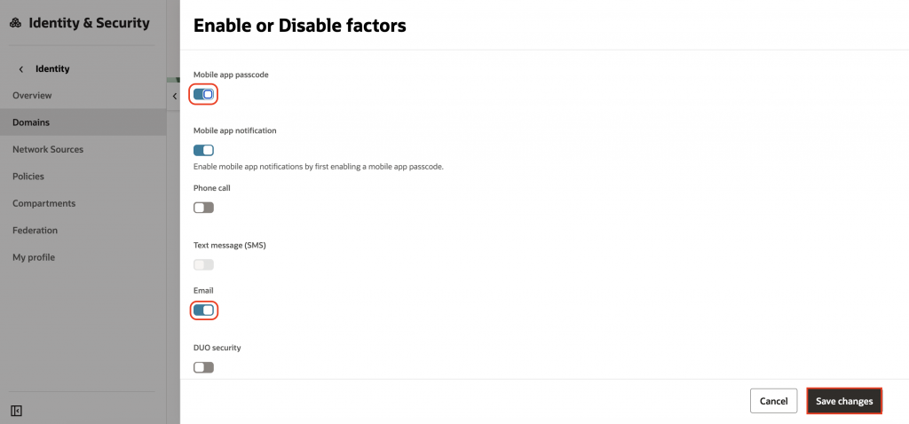 18. Navigate back to Default domain, go to Authentication tab, click Enable or Disable factors. Select your Multi-Factor Authentication (MFA) methods. For this example, we will enable Email and Mobile app passcode.