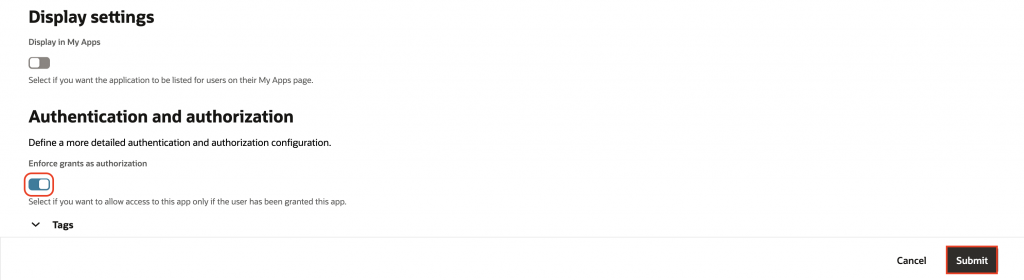 https://oracleapex.com/ords/r/apex/<workspace>/<app-alias>/). - Under Authentication and authorization, enable Enforce Grants as Authorization.