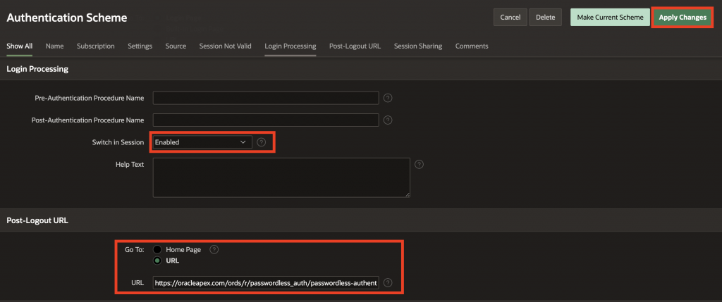Go back to the passwordless-auth authentication scheme. Under Login Processing, enable Switch in Session. Next, in the Post-Logout URL setting, choose URL, enter the page you want users redirected to after logout, and then click Apply Changes.