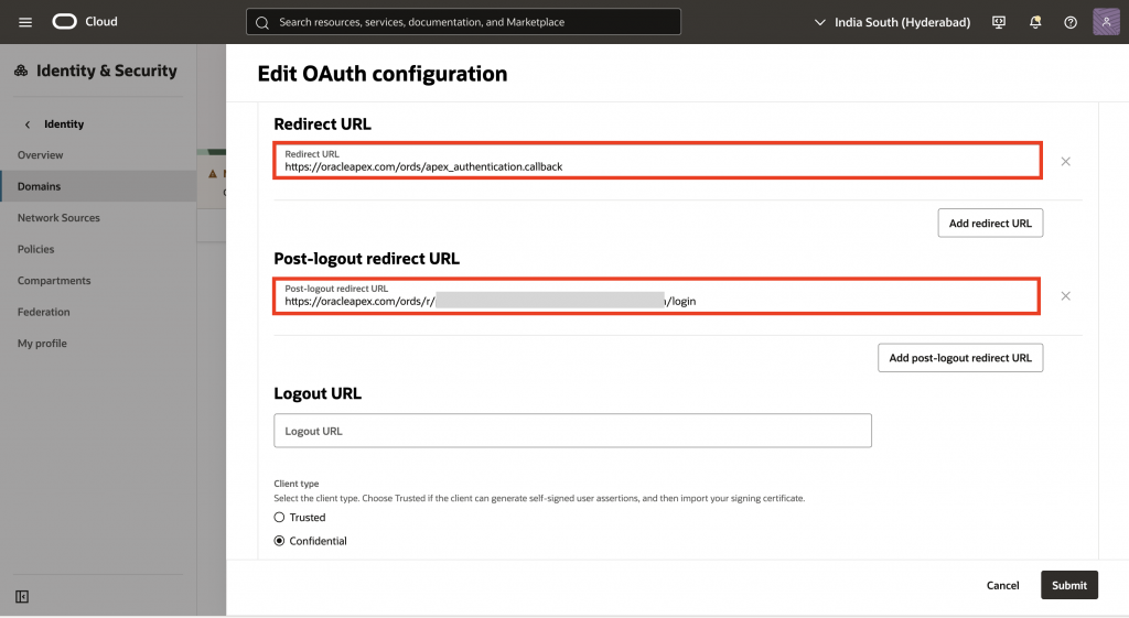 10. For Post Logout URL, enter the APEX app URL which the users should be redirected after logging out from the application, then click Submit.