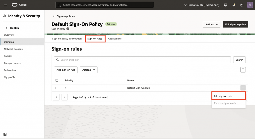 15. Go to Sign-on rules tab, edit the Default Sign-On Rule, and click Continue.