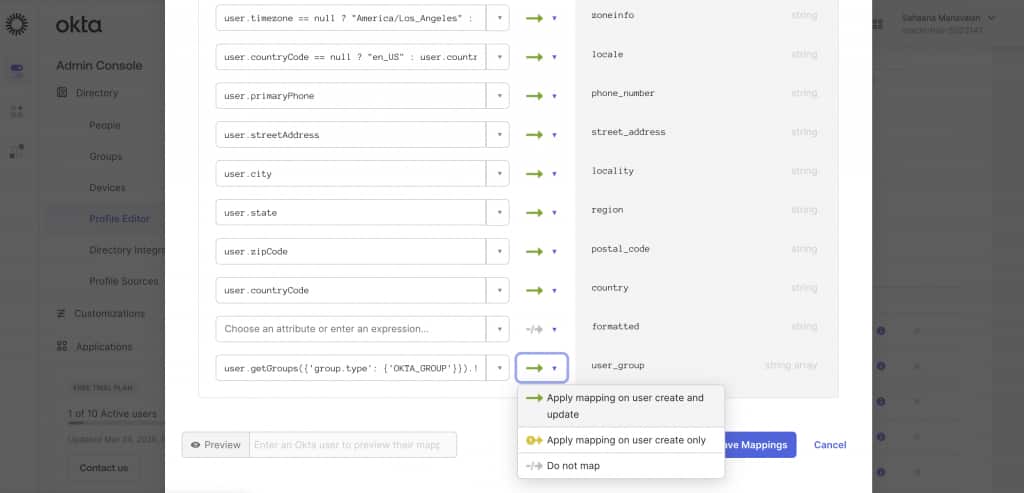 Note: This expression retrieves all Okta group names the user belongs to and concatenates them into a comma-separated string