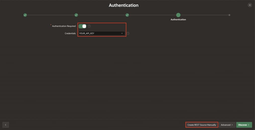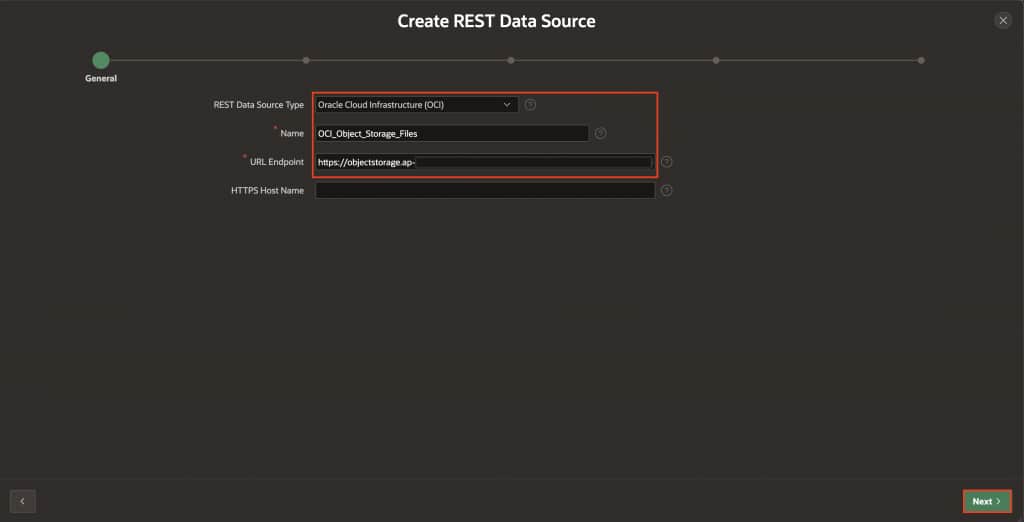 oci_apikeys(the credential created in Step 2). - Click Create REST Data Source Manually.
