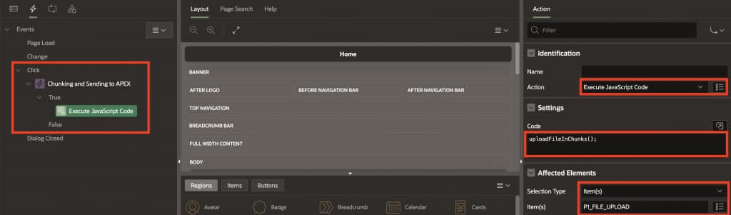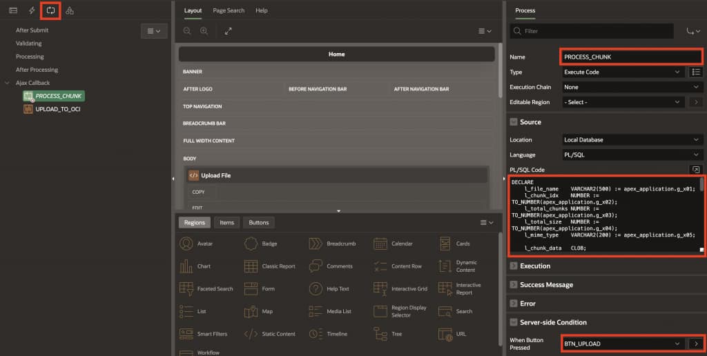 This JavaScript reads the selected file, slices it into chunks based on chosen size, converts each chunk to Base64 (required for APEX transmission), sends chunks sequentially via AJAX, displays real-time progress, and triggers OCI Object Storage REST API to upload after all chunks are received.
