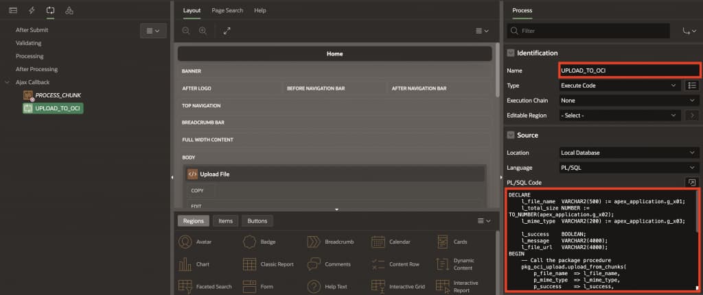 The approach is straightforward: JavaScript splits large files into smaller chunks (typically 10-20MB) on the client side before sending them to APEX. This client-side chunking is crucial because it prevents browser timeouts, allows for progress tracking, and works around APEX’s request size limitations. Each chunk is sent as a separate AJAX request, which stores them temporarily in a staging table. Once all chunks are received, they’re assembled and uploaded to OCI Object Storage using the multipart upload REST API – OCI’s recommended approach for files larger than 100MB. This dual-layer chunking strategy – first breaking files into manageable pieces for APEX transmission, then using OCI’s multipart upload for the final storage – creates a robust, enterprise-grade solution that handles network interruptions gracefully and provides real-time upload feedback to users.