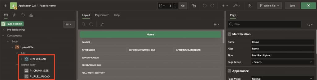 - Right-click on the Upload File region again and select Create Page Item.