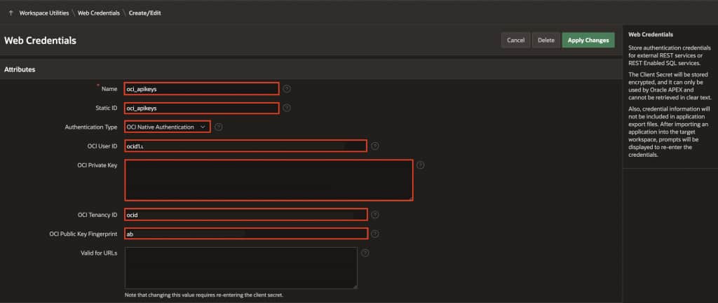 APEX will now automatically sign API requests to OCI using these credentials.