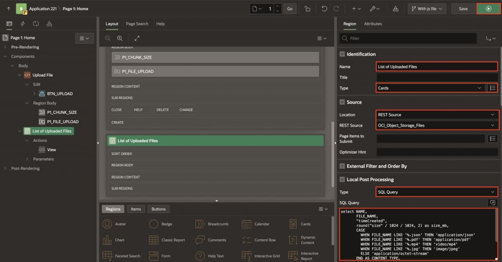 - In the List of Uploaded Files region properties, scroll to Local Post Processing, select Type: SQL Query