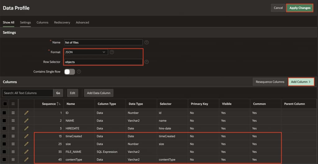 4. Click Add Column and configure these columns to extract data from the OCI response: