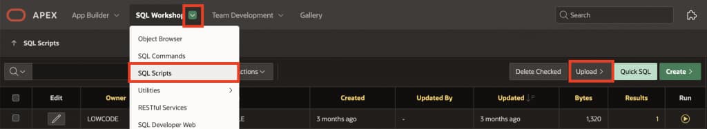 - In your APEX workspace, navigate to SQL Workshop > SQL Scripts