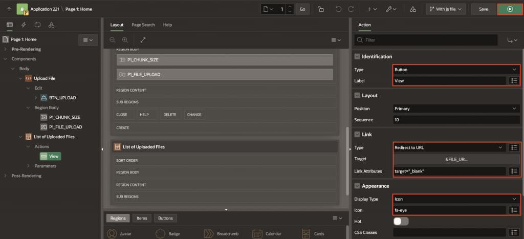 - Right-click on the Upload File region and select Create Button