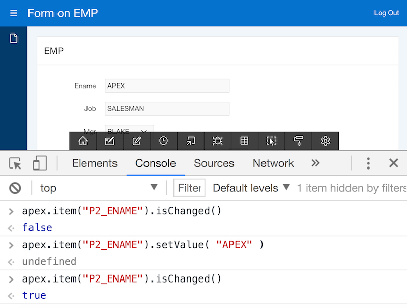 These functions are perfectly suited to bring functionality to your Application Express forms: Do all the things which Dynamic Actions provide, within your Javascript code. Activate and deactivate, show and hide items. Access or change item values programmatically, regardless whether this is a plain text field, a date picker or a select list. Even determine whether a form item value has been changed and decide whether or not to perform an AJAX request to the server.