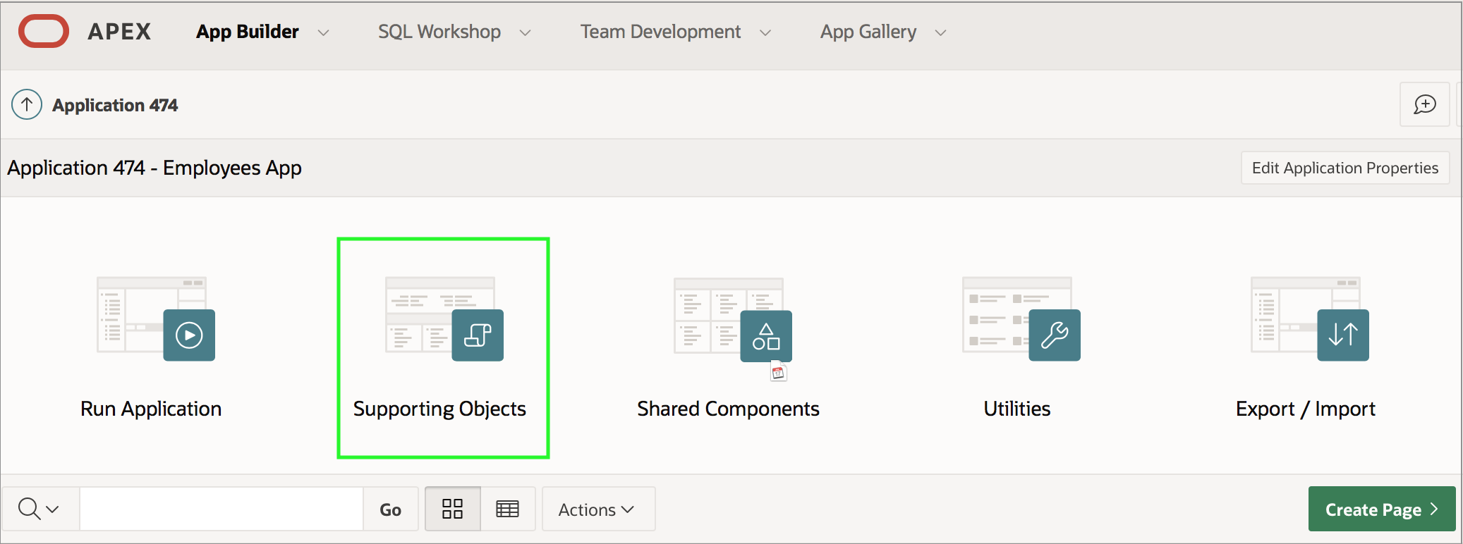 - In your development environment (APEXDEV in this example), navigate to your application home page and click Supporting Objects.