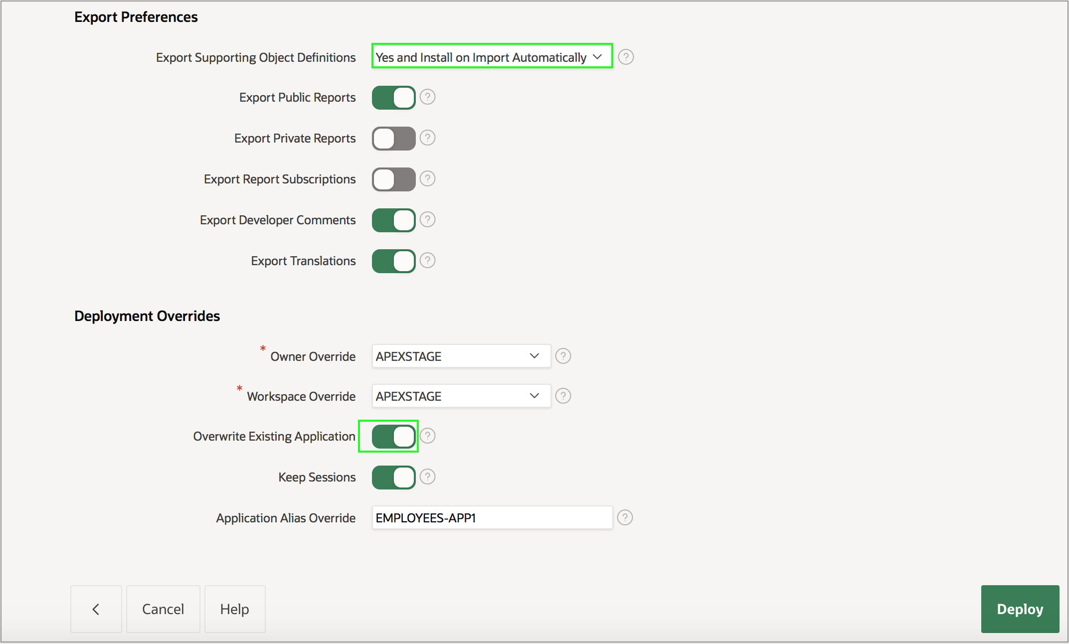 - Export Preferences: You include support object definitions in your export and ensure that they are installed into the deployment server automatically upon deployment. In this example, for Export Preferences > Export Supporting Object Definitions, select Yes and Install on Import Automatically.