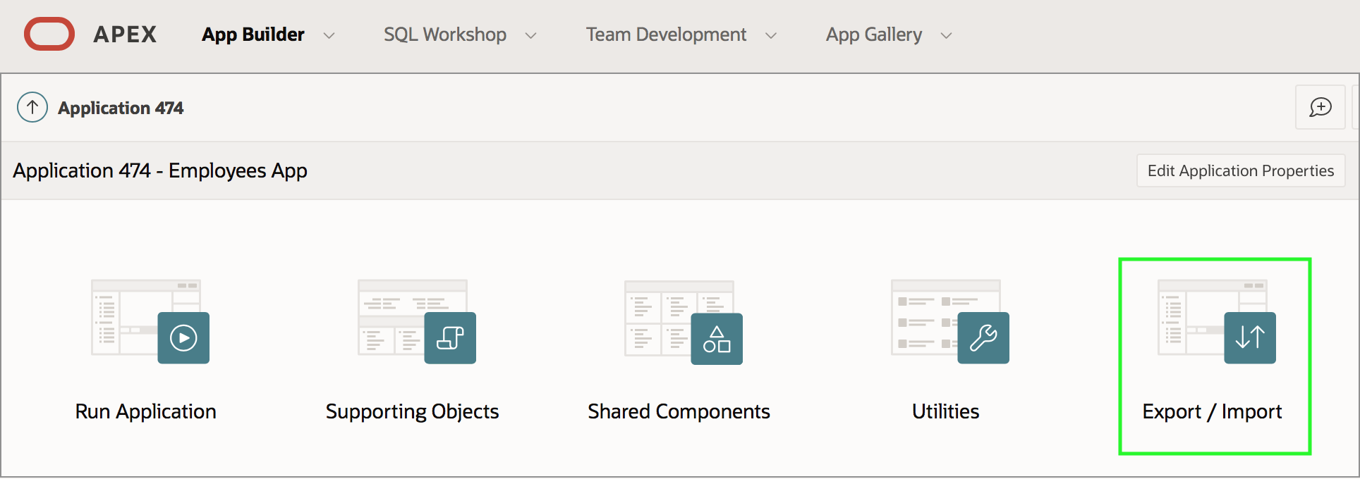 - In your development environment (APEXDEV in this example), navigate to your application home page. Click Export / Import.