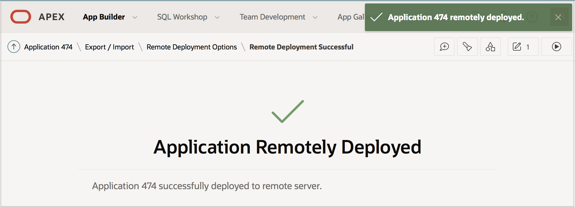 You see the Remote Deployment Successful message. Your application has been successfully deployed to remote server (APEXSTAGE in this example).