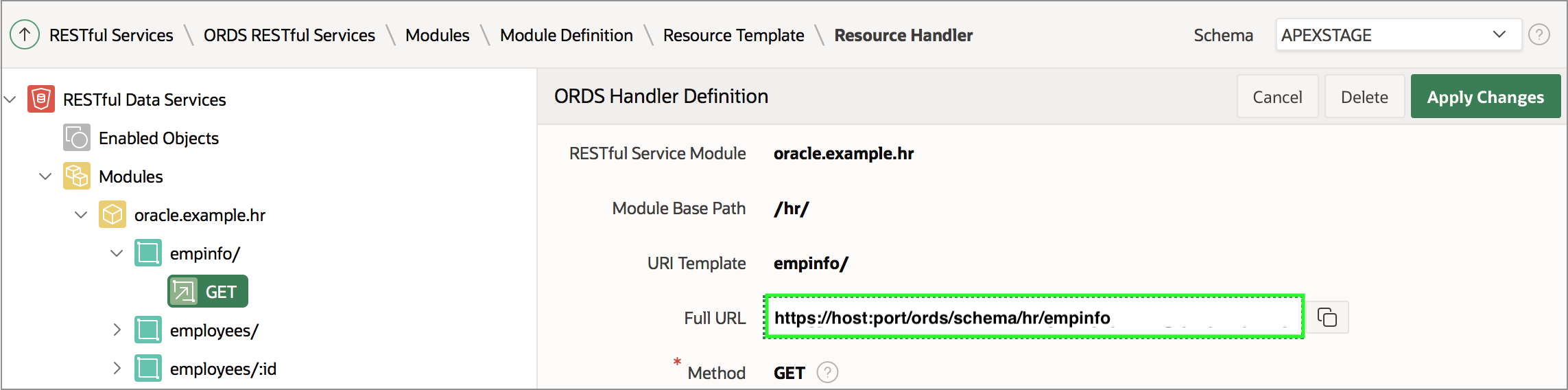 Expand RESTful Data Services > Modules > oracle.example.hr > empinfo/ GET. Copy the Full URL.