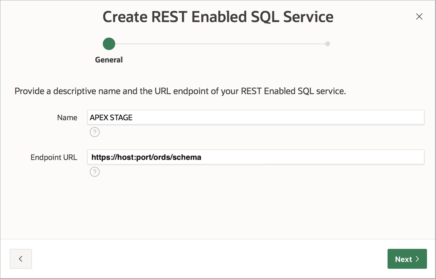 Switch to the browser tab of your development workspace (APEXDEV) and in the Create REST Enabled SQL Service wizard, for Name, enter APEXSTAGE. For Endpoint URL, paste the base URL copied from the deployment instance in the previous step. The base URL should include the ORDS context root and schema URL prefix. For example, https://host:8096/ords/apexstage Then, click Next.