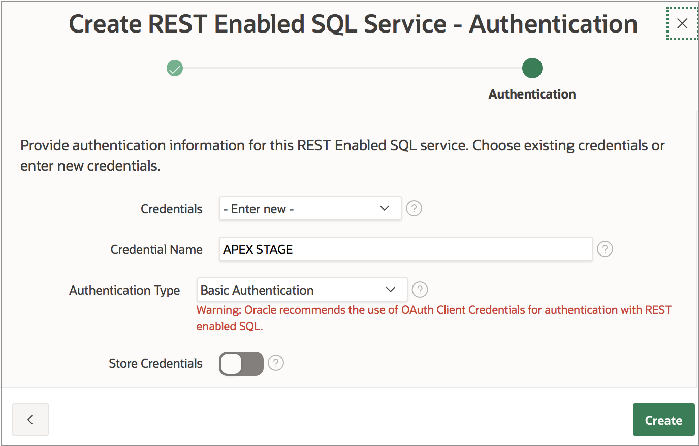 Enter APEXSTAGE for Credential Name, select Basic Authentication for Authentication Type, and turn off the Store Credentials switch. Click Create.