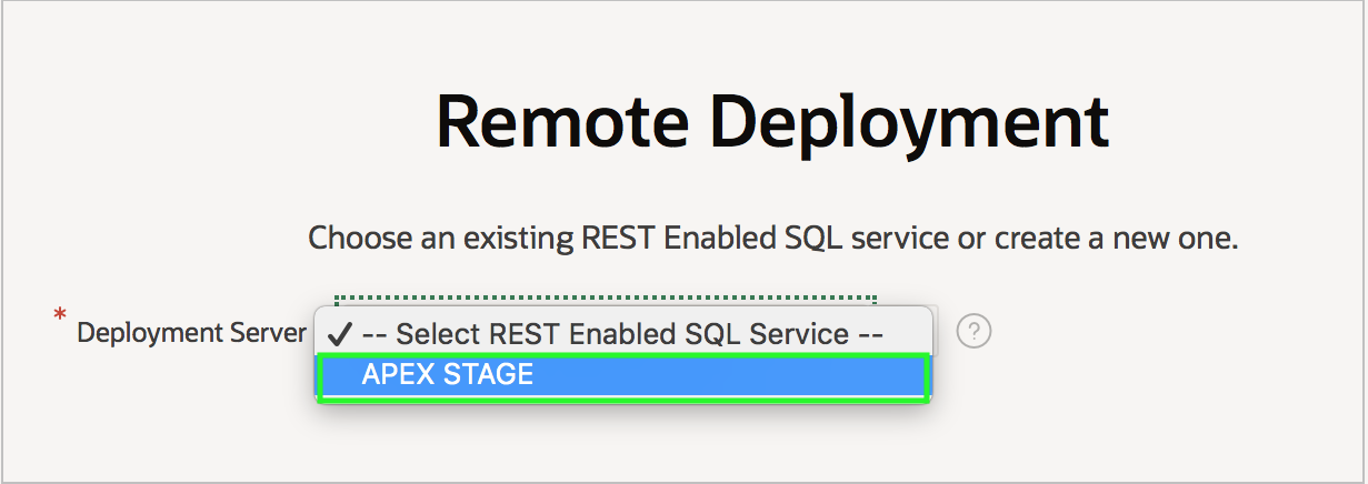 - Enter the base URL for the REST Enabled SQL Service defined for your deployment server (APEXSTAGE in this example). The schema in your deployment server has already been enabled for use with ORDS RESTful Data Services in prerequisites.