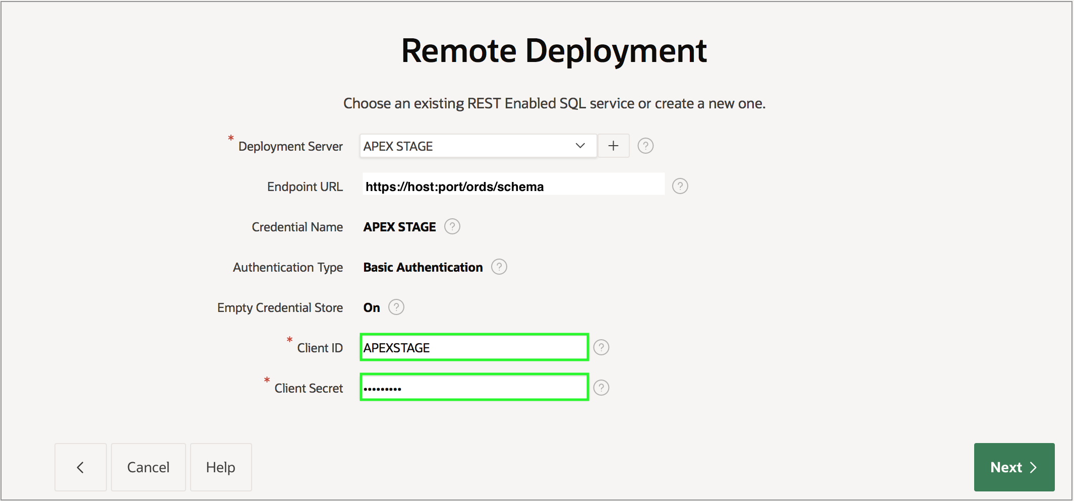 ORDS REST Enabled SQL Service supports Basic Authentication and OAuth2 Client credentials flows. Oracle recommends always using empty credentials for remote application deployment in shared development environments so only those with the knowledge of those credentials can deploy applications or run SQL or PL/SQL on the REST Enabled SQL reference. If Store Credentials is turned off, the named credential will be created, with NULL values stored as Client ID and Client Secret.