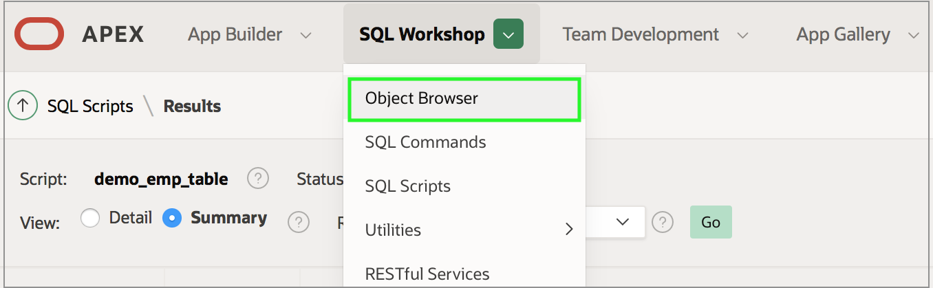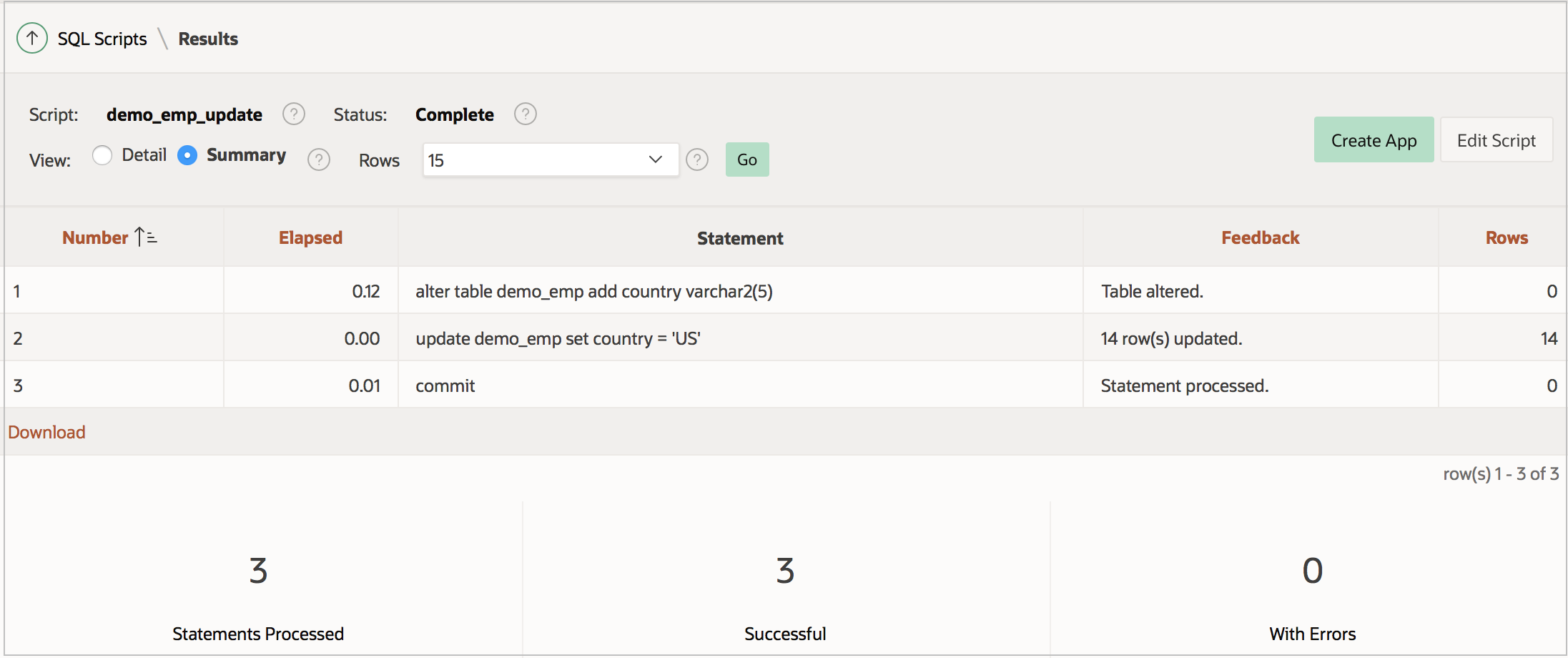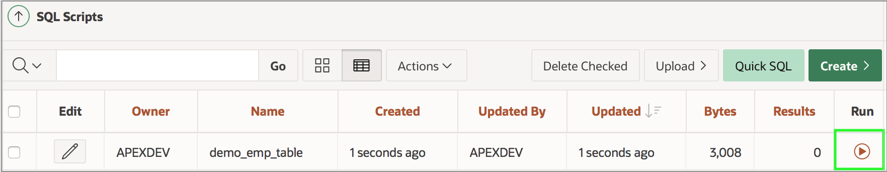 - Log in to your development environment (APEXDEV in this example) and create an application on the DEMO_EMP table. To create the table and load sample data, you can use the demo_emp_table.sql. Navigate to SQL Workshop > SQL Scripts and then click Upload.
