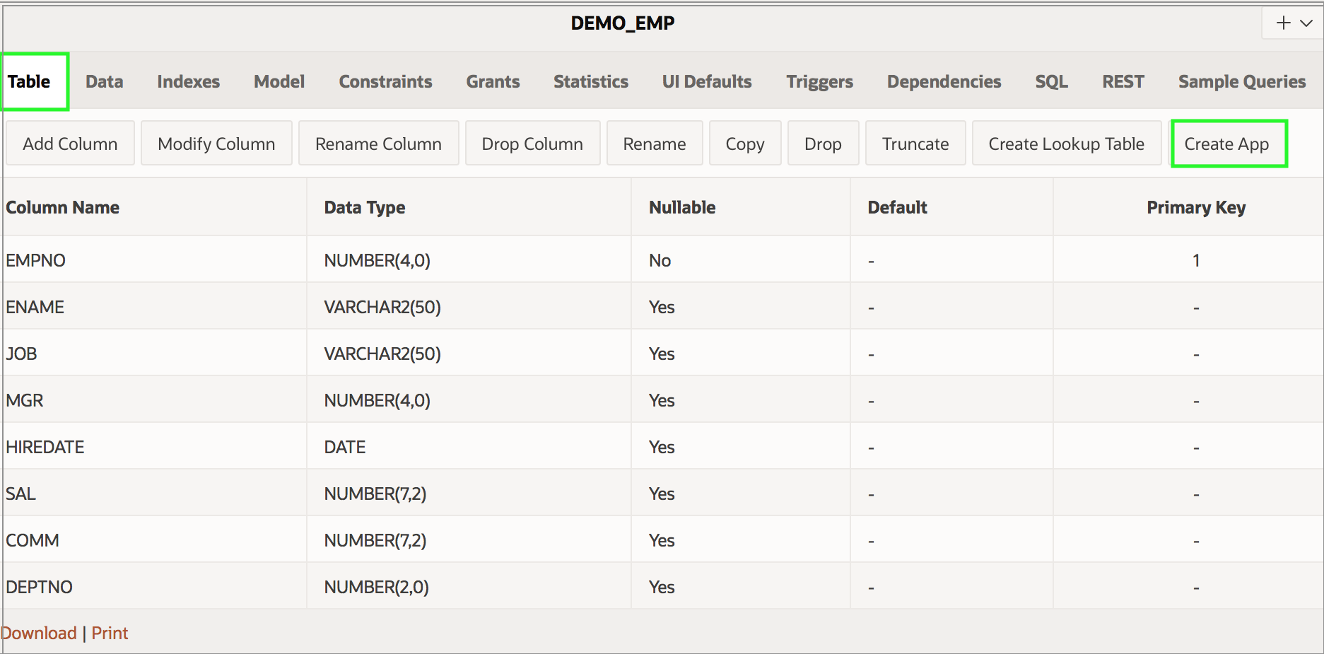 - Under Tables, locate and click DEMO_EMP. Click Data to review.