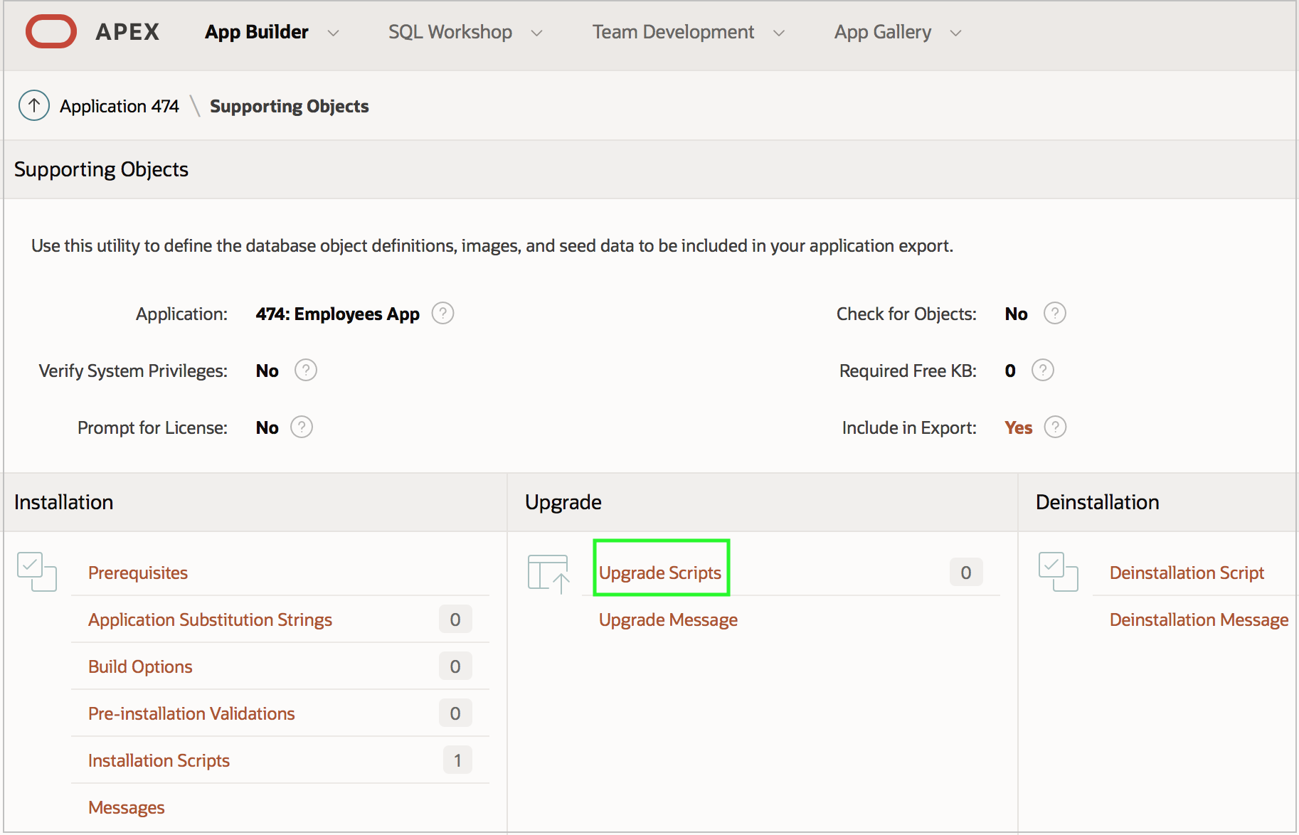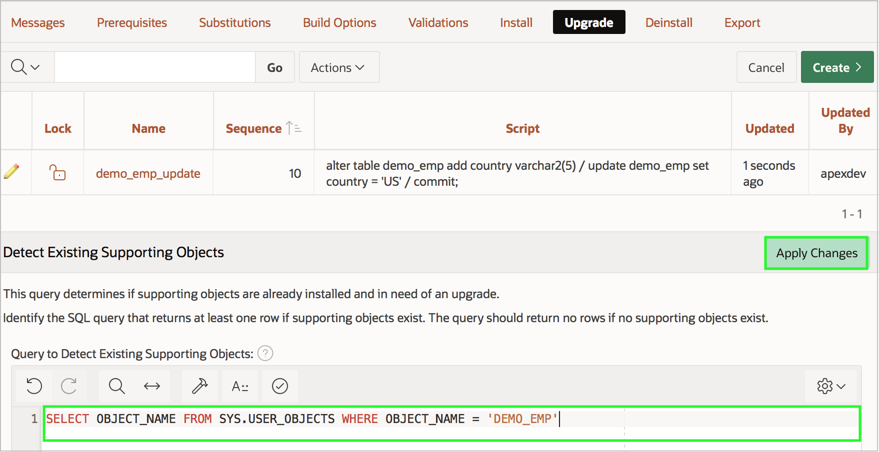 Add the supporting object installation scripts so that you can include them along with the application definition. In this example, you will add demo_emp_table.sql under Installation scripts. This script includes the DDL for DEMO_EMP table and also the INSERT statements for the sample data.