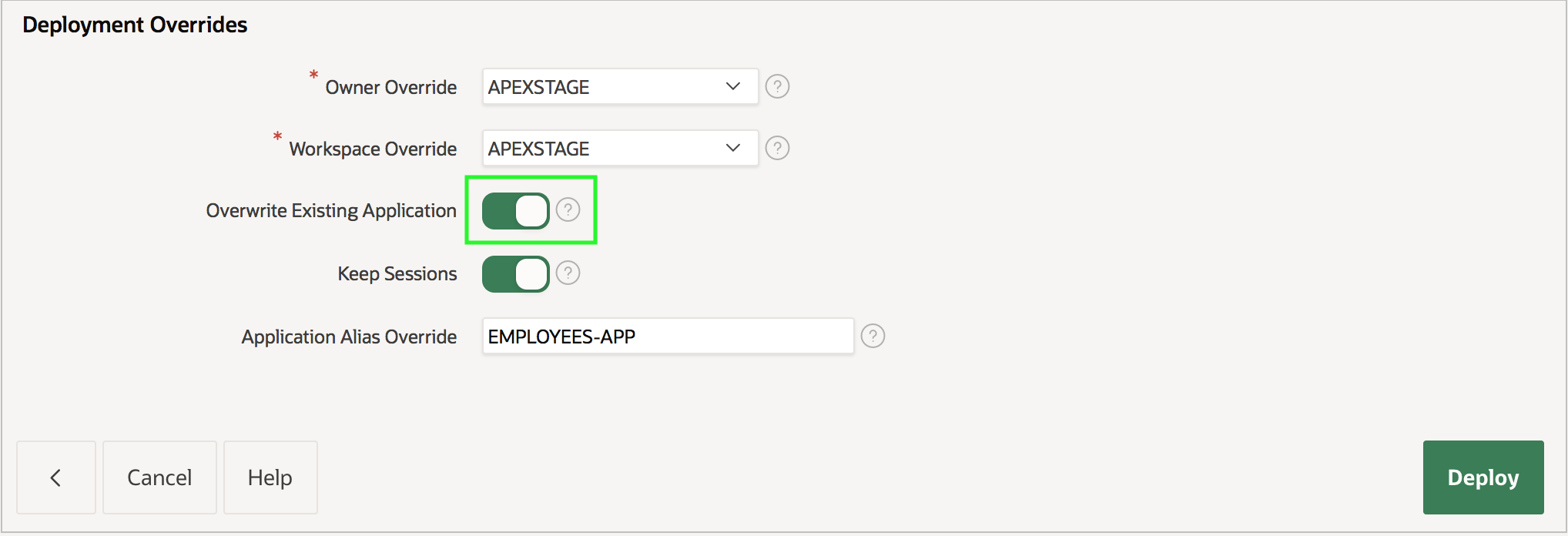 - The application should be overwritten on the target system. For Deployment Overrides > Overwrite Existing Application: Turn On.