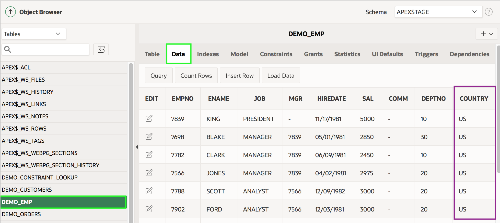 Navigate to SQL Workshop > Object Browser. Click DEMO_EMP. Notice that the COUNTRY column is available.