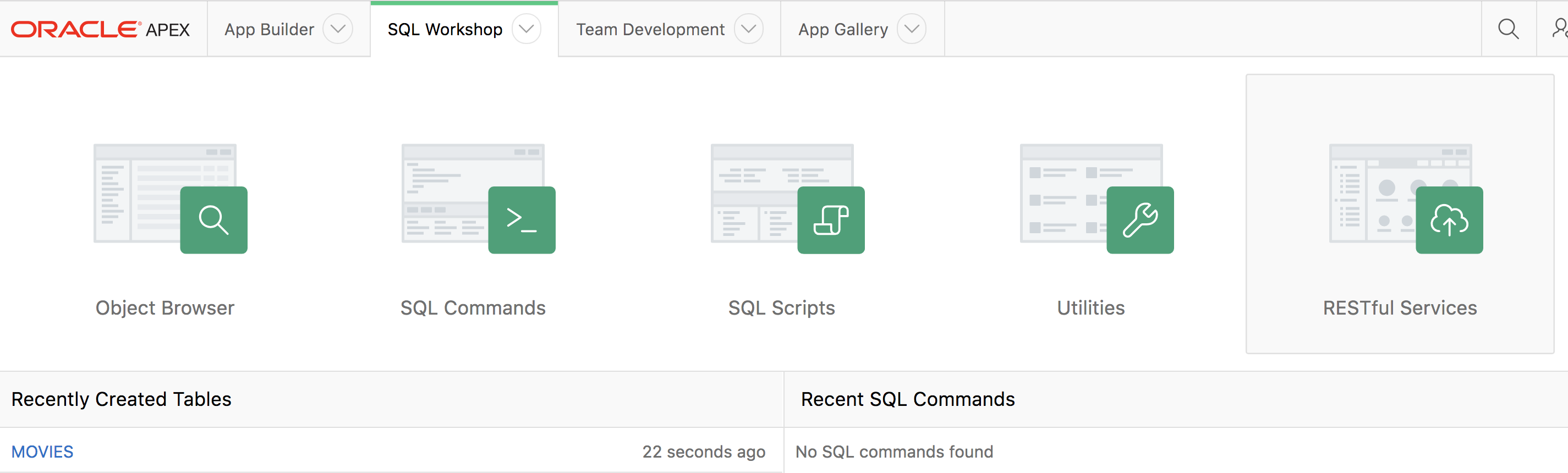 Next, we’ll expose a REST API for that table. Navigate to SQL Workshop > RESTful Services.