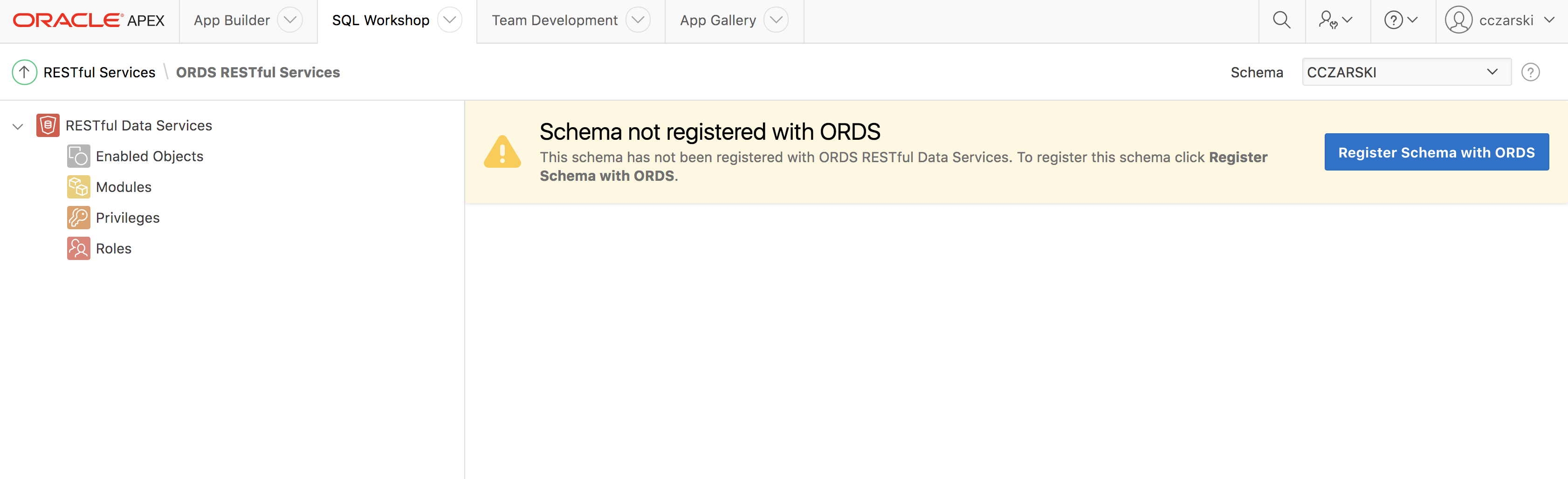 You should see a message that your schema as not been registered with ORDS so far. Click the Register Schema with ORDS button.