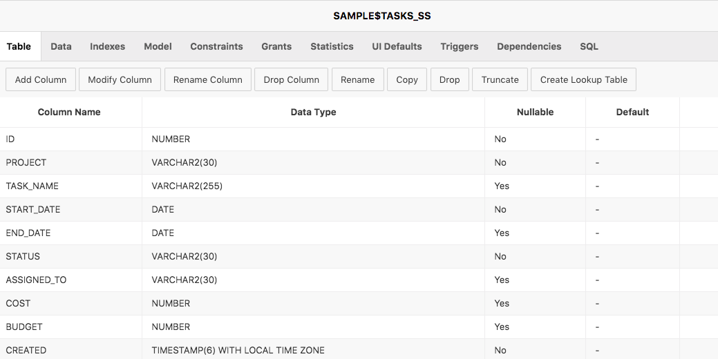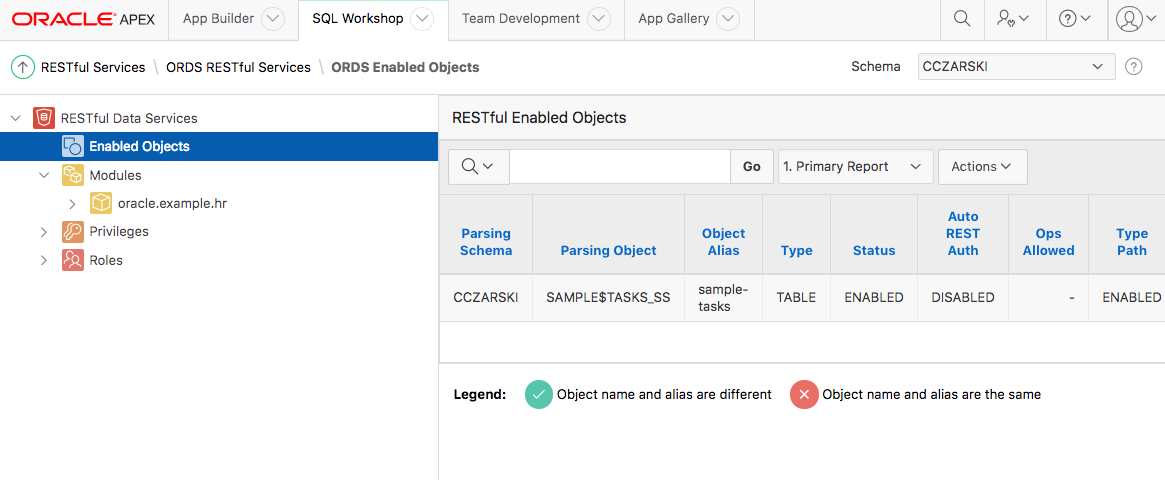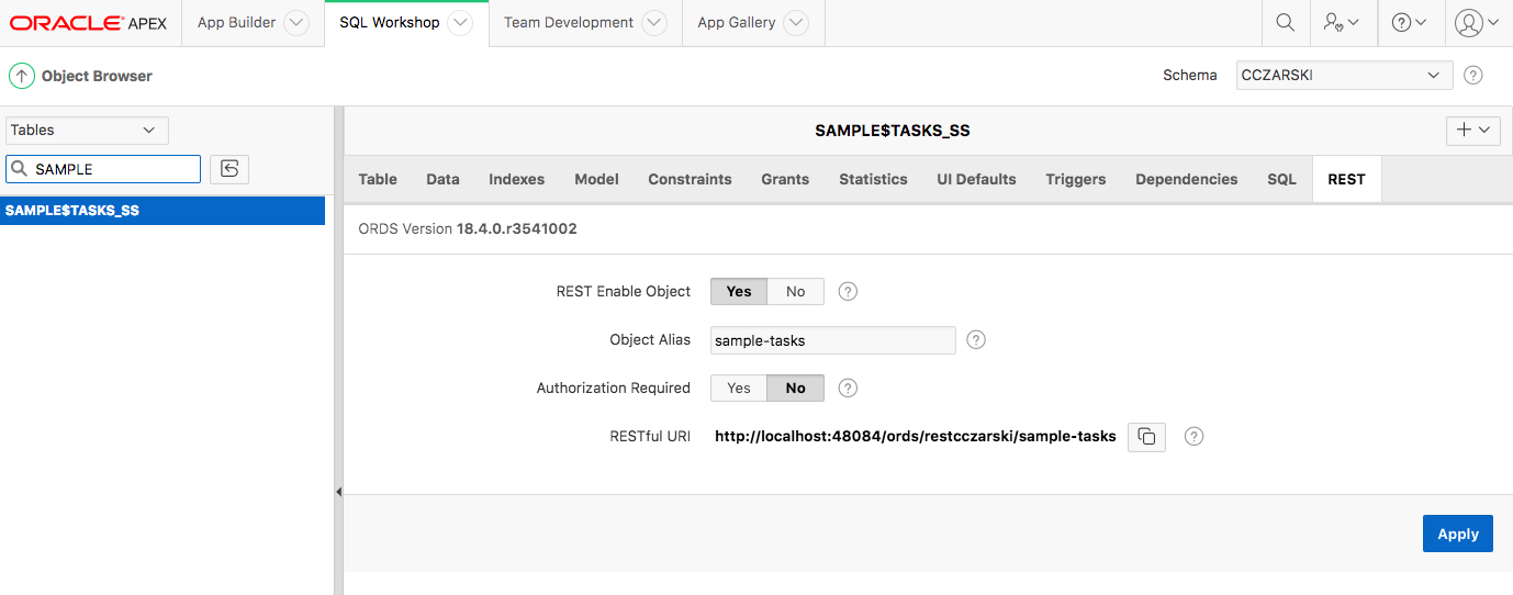 Now, the list of Enabled Objects in SQL Workshop > RESTful Services should contain an entry for the SAMPLE$TASKS_SS table. That means, we have exposed a REST API for that table.