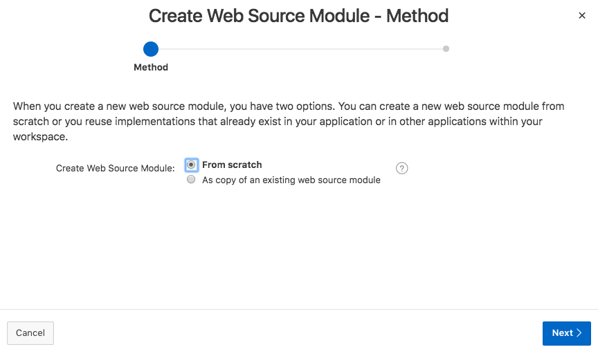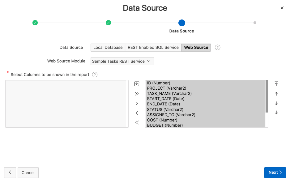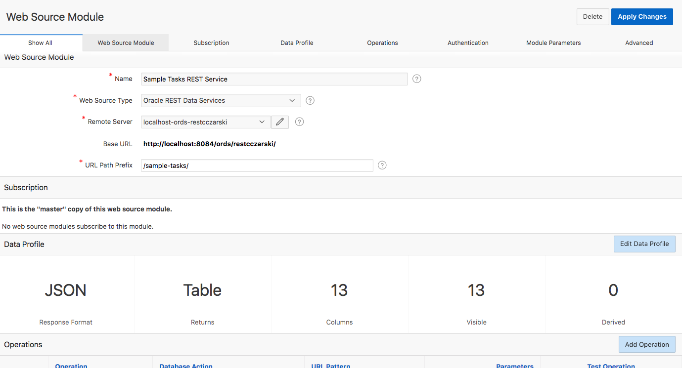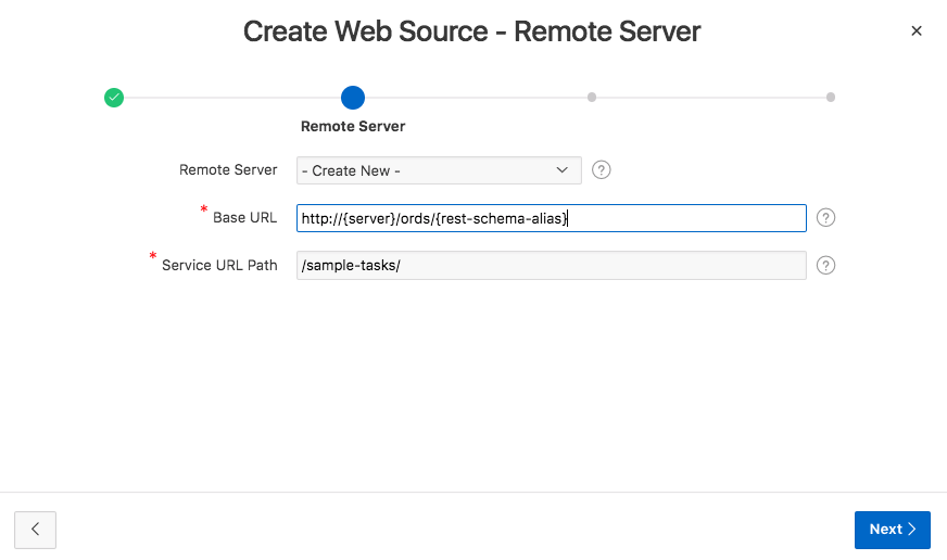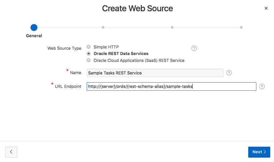 In the next wizard step, provide a name for the Web Source Module and the URL which also used when trying the REST service with your browser: http://{server}/ords/{rest-schema-alias}/sample-tasks