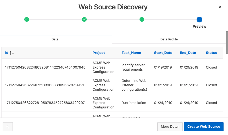 After clicking Discover, APEX will invoke the REST service URL. From the JSON response, APEX derives attributes and their data types and uses this to create a Data Profile. The final step of the wizard should look as follows.