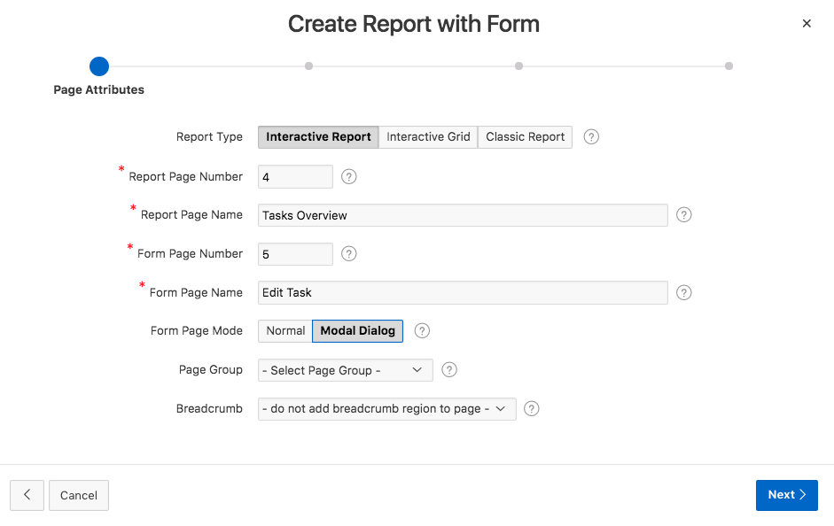 - Specify whether to have the form page created as a modal dialog or as a normal page