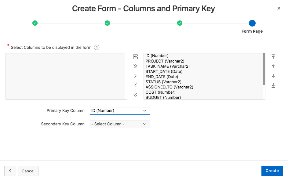 Click Next to configure the form page. As in the previous step, keep all columns, but designate the ID column as the Primary Key. It’s clear that APEX treats a Web Source like a table with rows and columns. And as for a table, we need a primary key to identify existing rows.