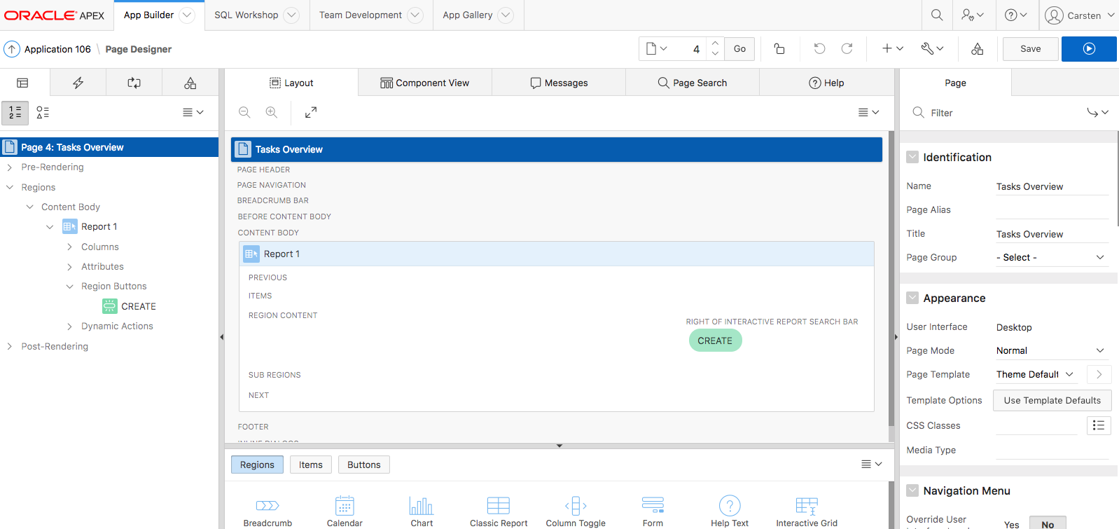 Next, we’ll start to use this Web Source Module in the APEX Application. With just a few mouse clicks, we’ll create an overview report and a form to edit data on the REST service – without any manual PL/SQL or SQL coding.