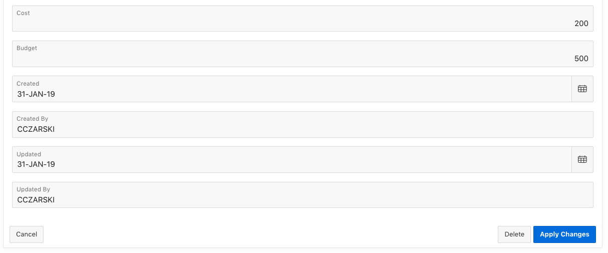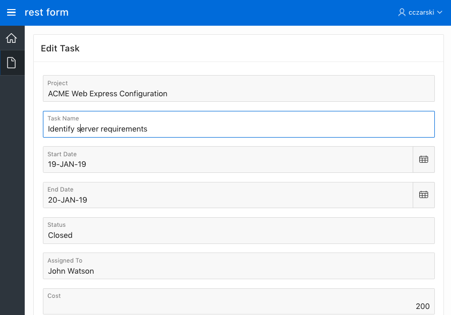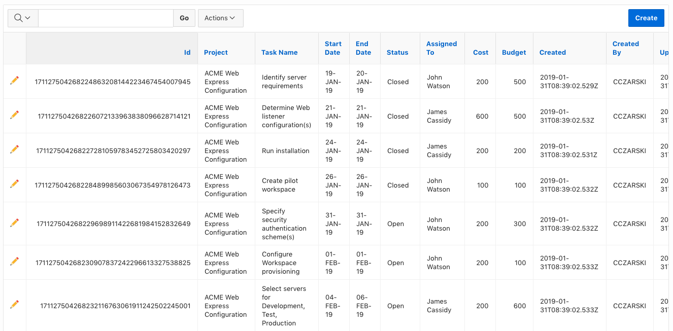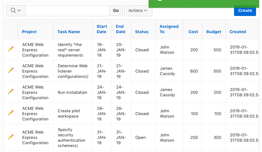 -d'{"project":"APEX 19.1","task_name":"Evaluate Early Adopter","start_date":"2019-03-01T00:00:00Z","end_date":"2019-03-05T00:00:00Z","status":"Planned","assigned_to":"John Doe","cost":0,"budget":1000}' \