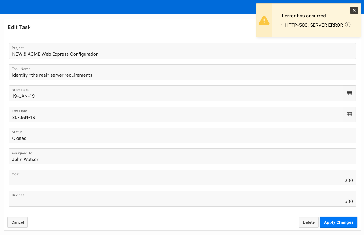 Let’s try another update now. On the report page, open the form for a row again and change the Project value to NEW!!! ACME Web Express Configuration. When you try to save this change, you’ll see an error message.
