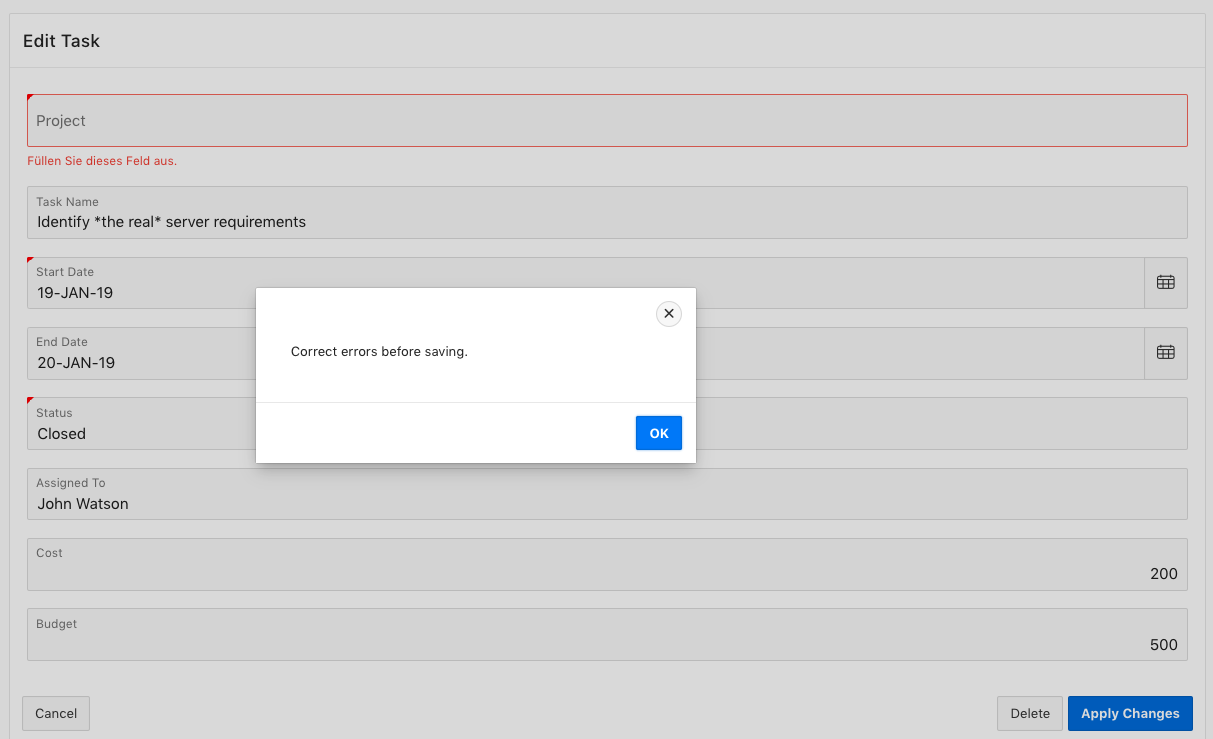 One that is done, run the form again. APEX now prevents the end user from entering invalid data. When working with REST services, it’s very important to have proper validations for all page items in place – since invalid data just leads to simple non-descriptive HTTP 500 or HTTP 400 messages.