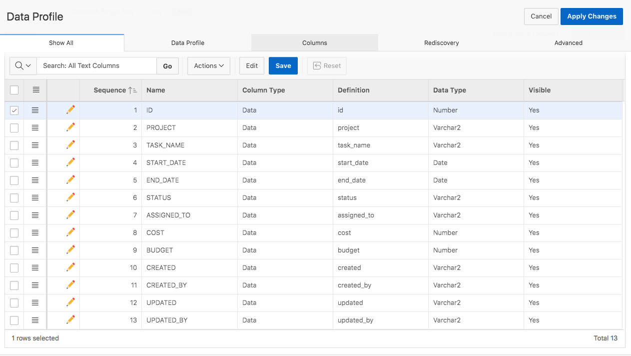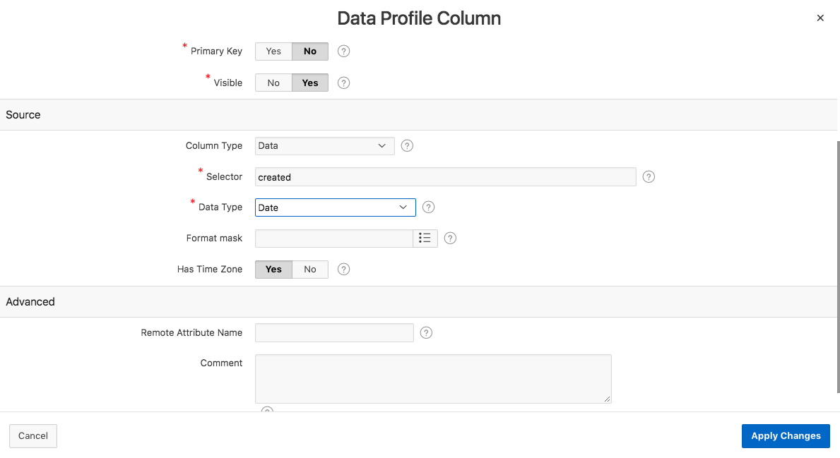 APEX nicely detected the attributes from the REST service JSON response. However, the CREATED and UPDATED columns were detected as VARCHAR2 columns, which is not correct. Let’s fix this right now. Click the yellow pencil for the CREATED column. Change the Data Type to Date and (since the JSON response contains values with time zone information), set the Has Time Zone attribute to Yes. Apply the same change to the UPDATED column as well.