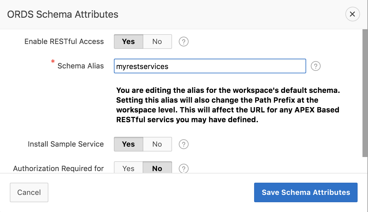 Provide a Schema Alias, if you wish and determine whether to install an additional sample REST Service as well. Then click the Save Schema Attributes button in order to enable the database schema for REST services. Note: That will not expose any REST API, but enable the schema to do so.