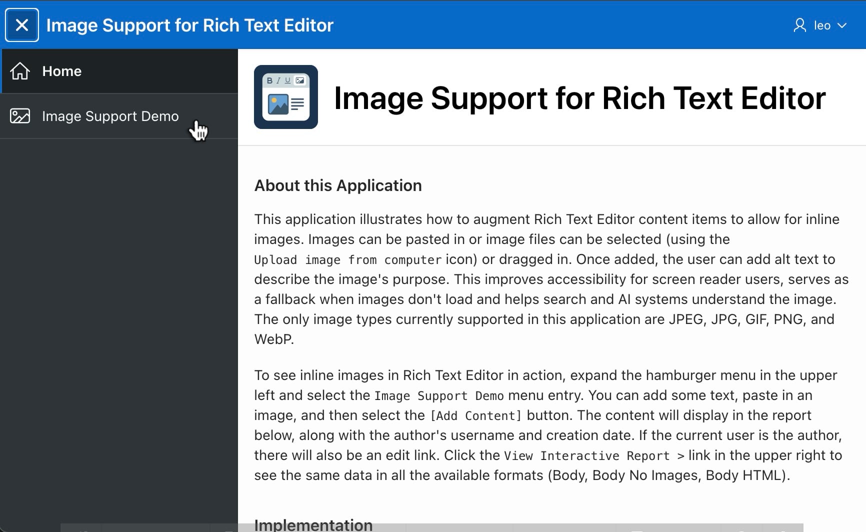 Run the app to view the overview page. It highlights key implementation details this article explains in more depth. Visit the Image Support Demo page and login to try out the functionality interactively. The application uses APEX Accounts authentication, so you can login using any account in your workspace.