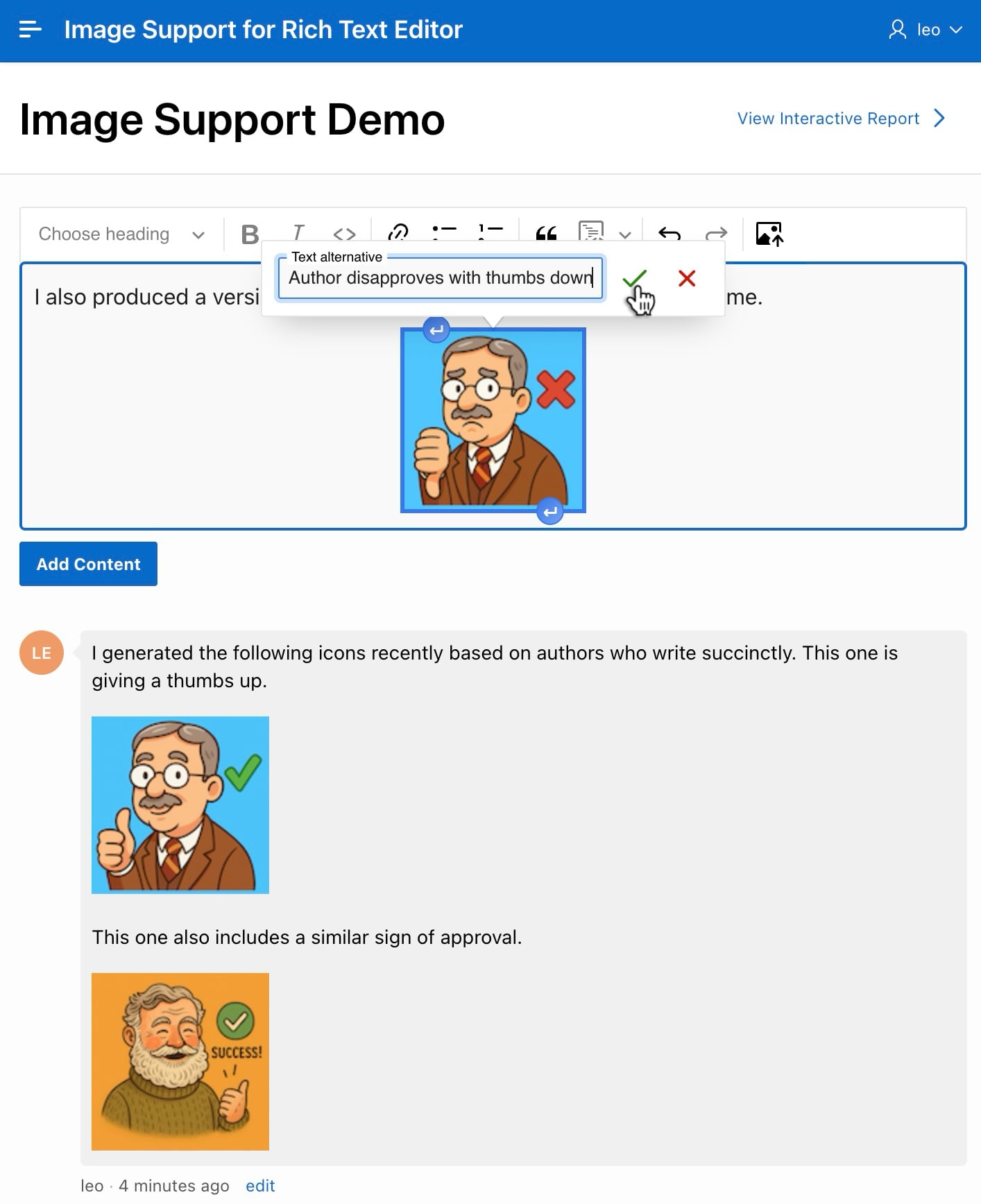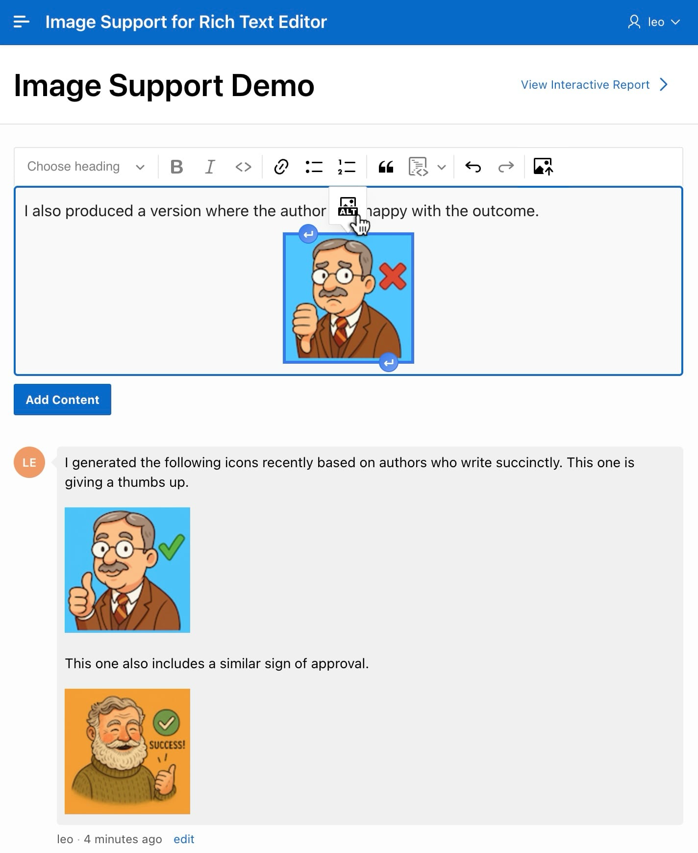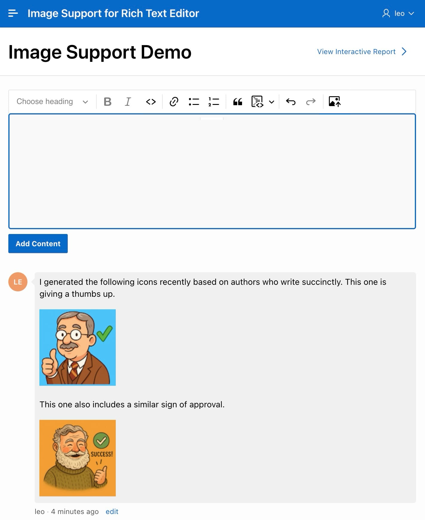 The sample’s Image Support Demo page has a Rich Text Editor item to add a comment. For example, as shown below, you can enter text and images. Add an image by dragging it into the editor and dropping it where you want it to go. Alternatively, position the cursor and then either: