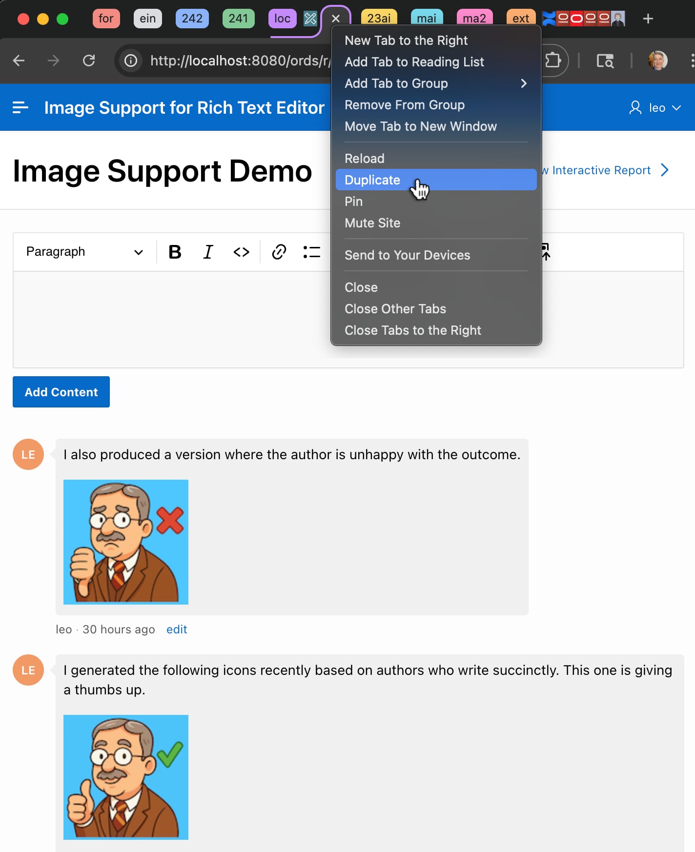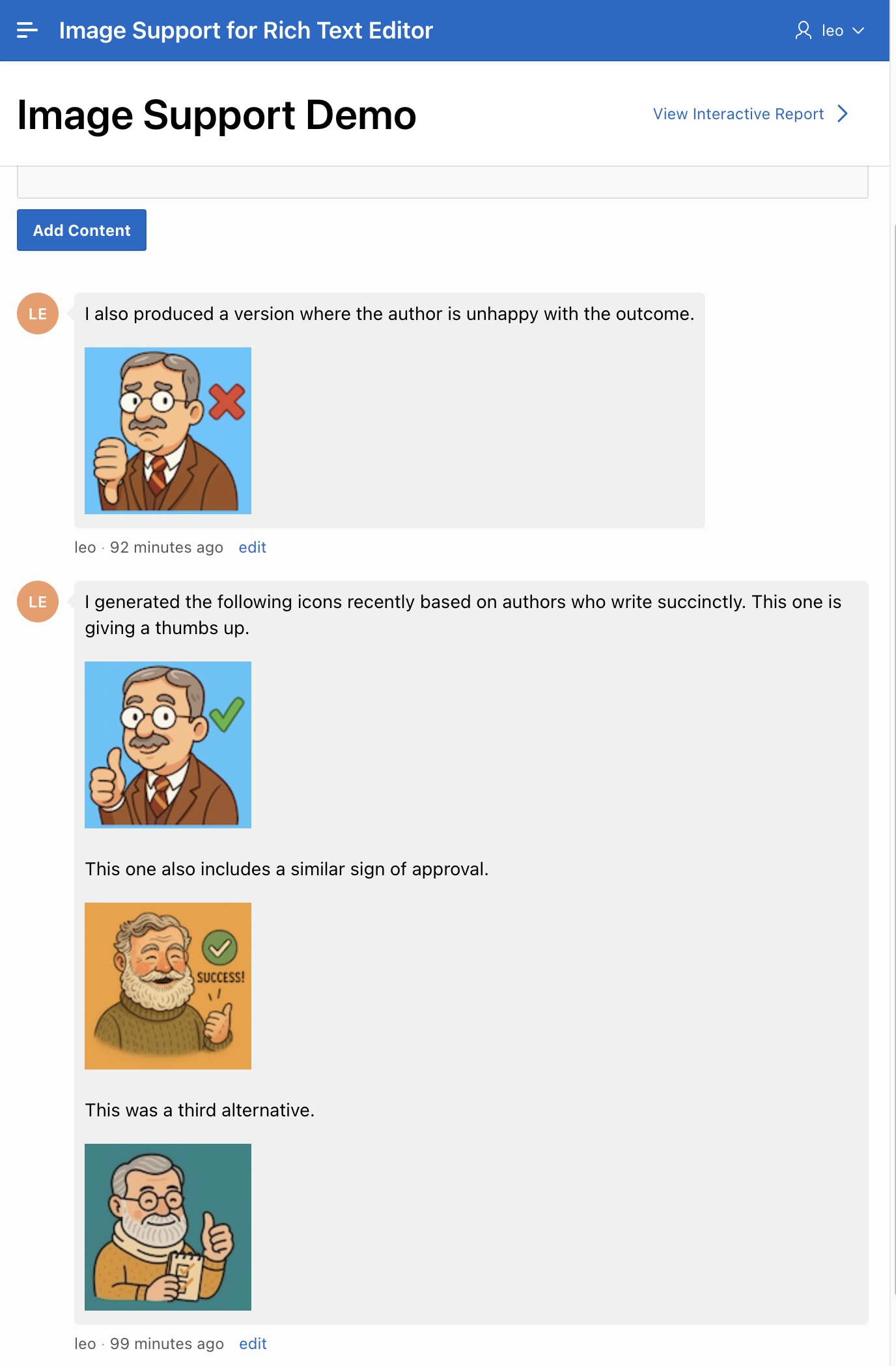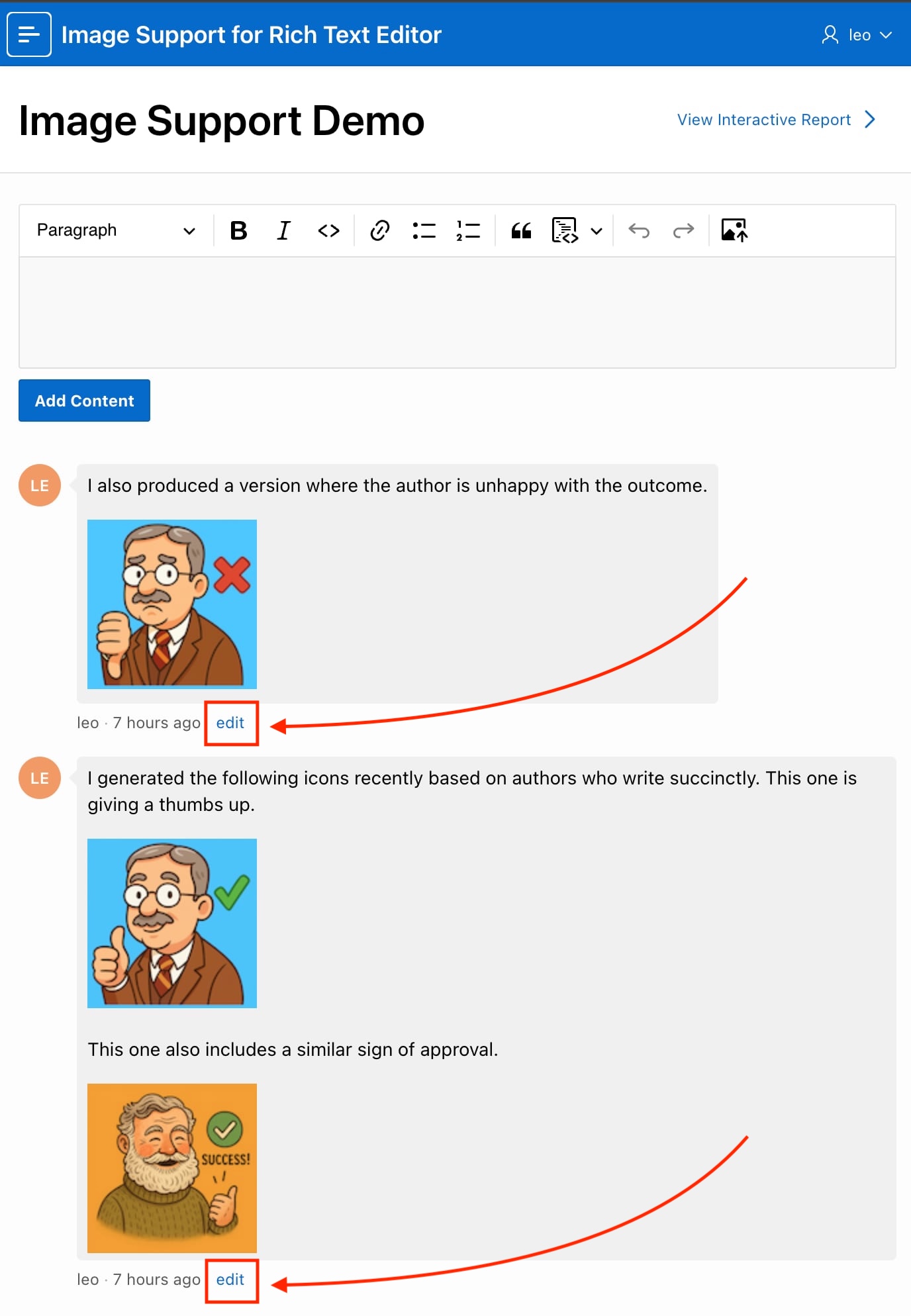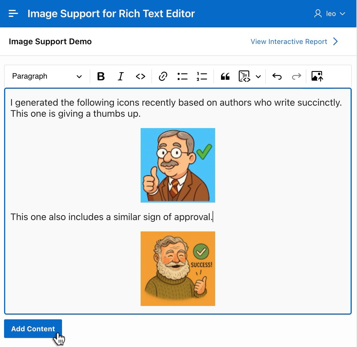 The sample’s Image Support Demo page has a Rich Text Editor item to add a comment. For example, as shown below, you can enter text and images. Add an image by dragging it into the editor and dropping it where you want it to go. Alternatively, position the cursor and then either: