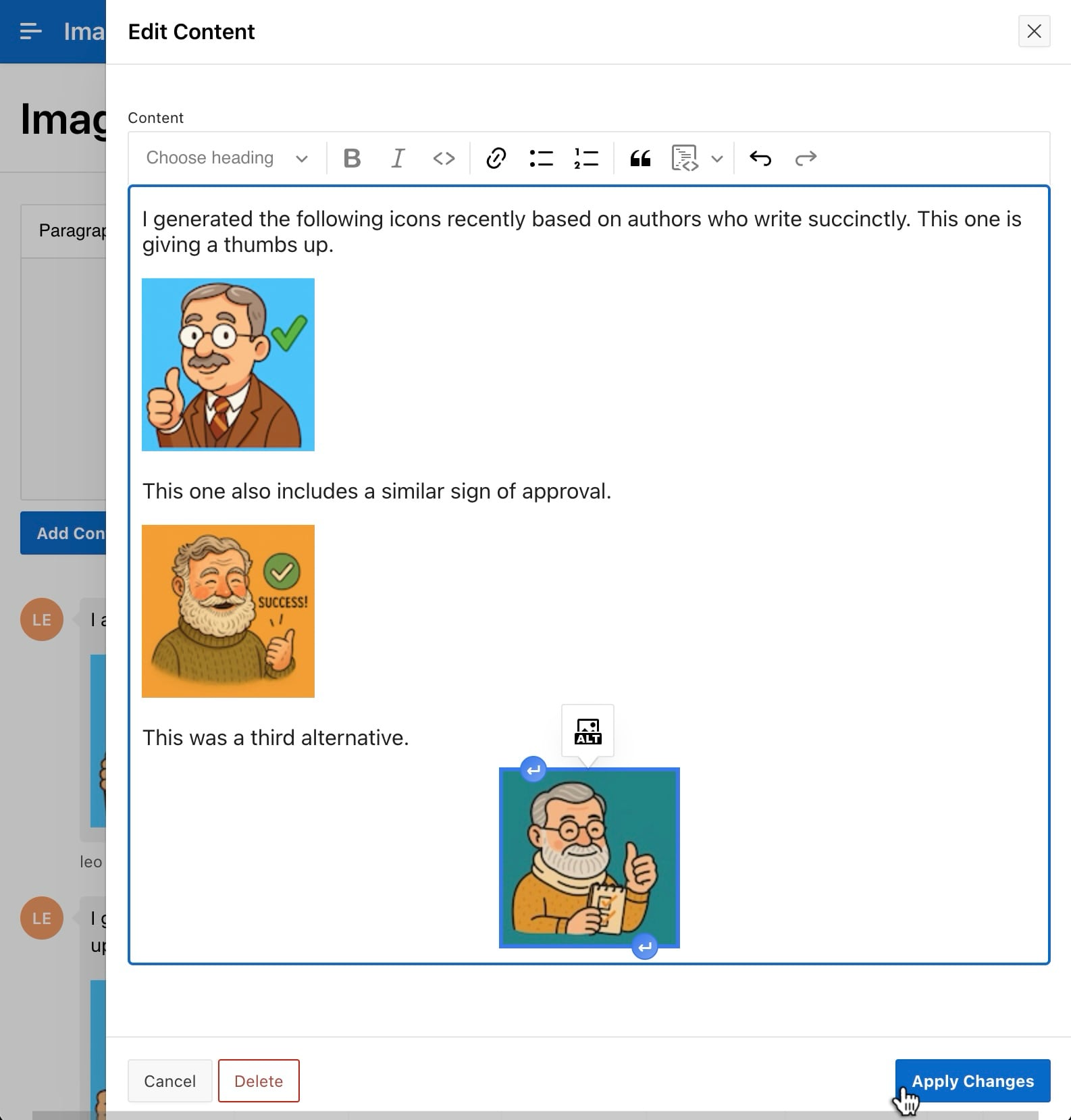 After adding an image, whenever it’s selected a small floating ALT icon appears above it. Click the icon to enter or edit the image’s alternative text.