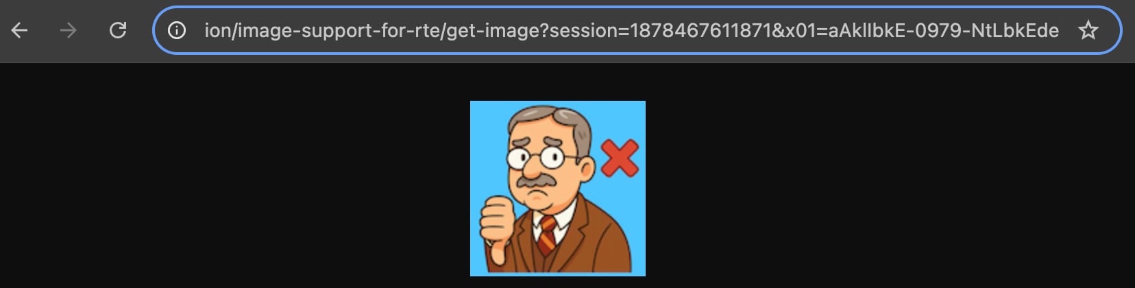 In the new tab, change the /demo? part of the URL to /get-image? instead, and after the session= query string parameter, add on the additional parameter &x01=aAklIbkE-0979-NtLbkEde to produce a new URL that ends like the one below (all in a single line!). Of course, your session ID value will differ so just use the session value that’s in the duplicated tab’s URL already: